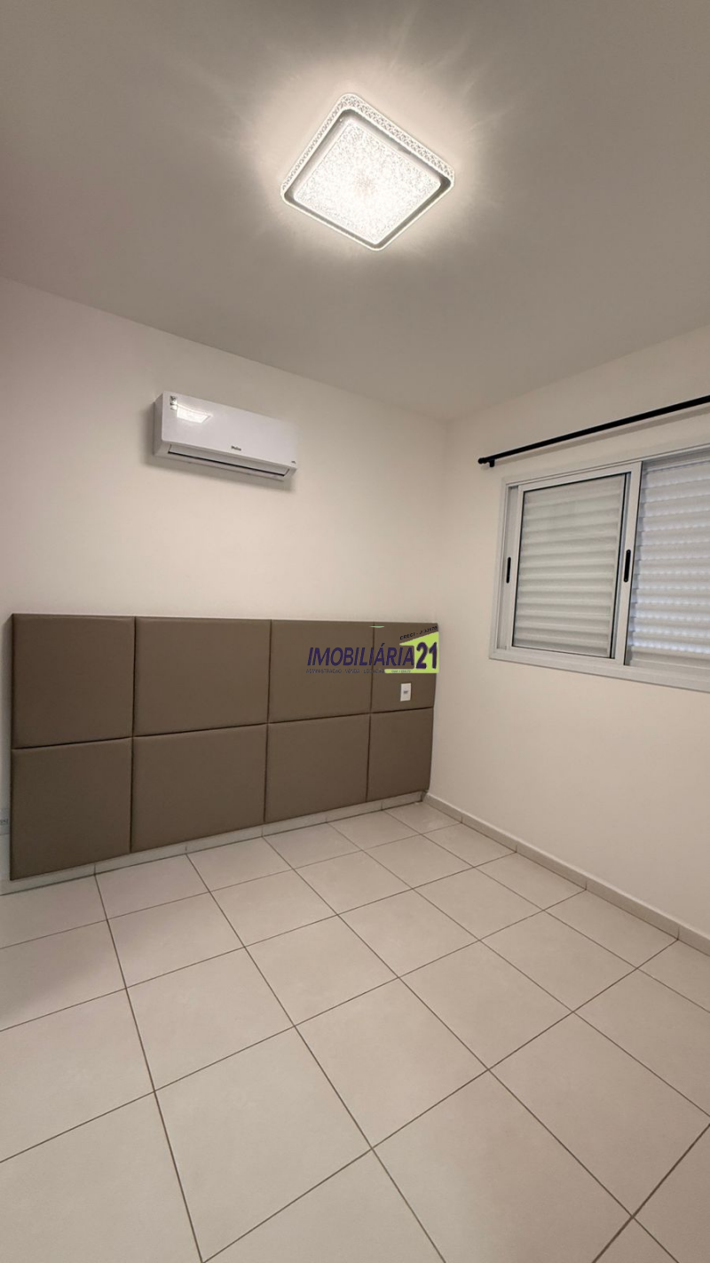 🛏️ Dormitório aconchegante com cabeceira estofada e ar-condicionado instalado.